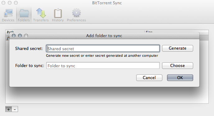 Установка BitTorrent Sync элементарна под любой системой, как впрочем и настройка. Для OSX и Win версий есть простой, но достаточный GUI и минимальная, по типу dropbox, индикация активности. Для прочих версий есть пристойный и полностью функциональный web-ui. Любой каталог в любом месте вашего диска можно добавить в btsync в пару кликов и назначить этому каталогу "Shared secret" (можно ввести руками либо сгенерировать автоматически). Этот shared secret является уникальным ключем к вашему каталогу без знания которого синхронизация невозможна. Все, что btsync передает/принимает защищено этим ключем и AES 256bit шифрованием. Тут наверняка возникнет вопрос о том, насколько надежна подобного рода защита. Действительно, вместо привычного имени и пароля тут вроде только пароль. Кроме того, никаких следов 2х факторной авторизации тут тоже нет, но не смотря на это, степень защищенности велика и случайно или намеренно подобрать ваш Shared secret практически невозможно. На форуме btsync этот вопрос поднимался многократно и может почитать детали тут, или тут или там.